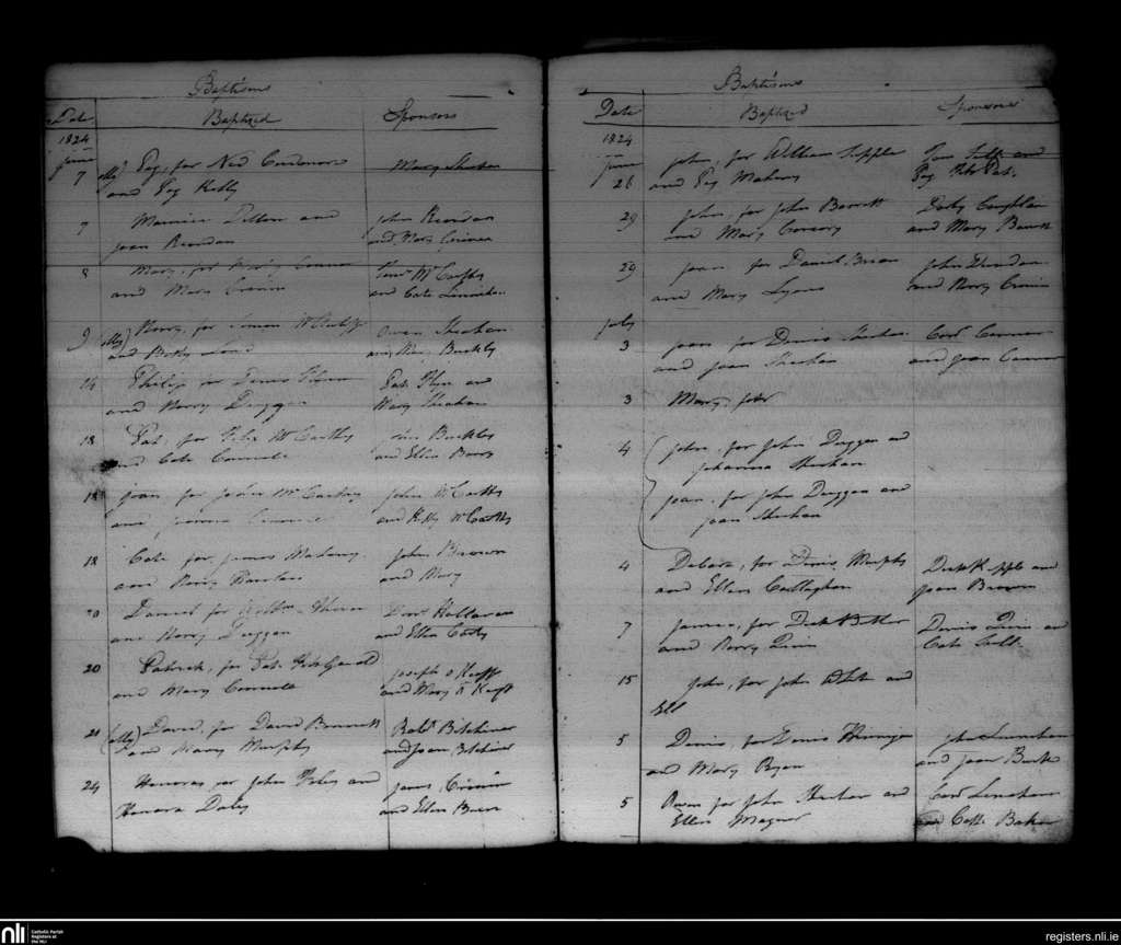 Ballyclough; County of Cork; Diocese of Cloyne. Baptisms, June 1824 to July 1824