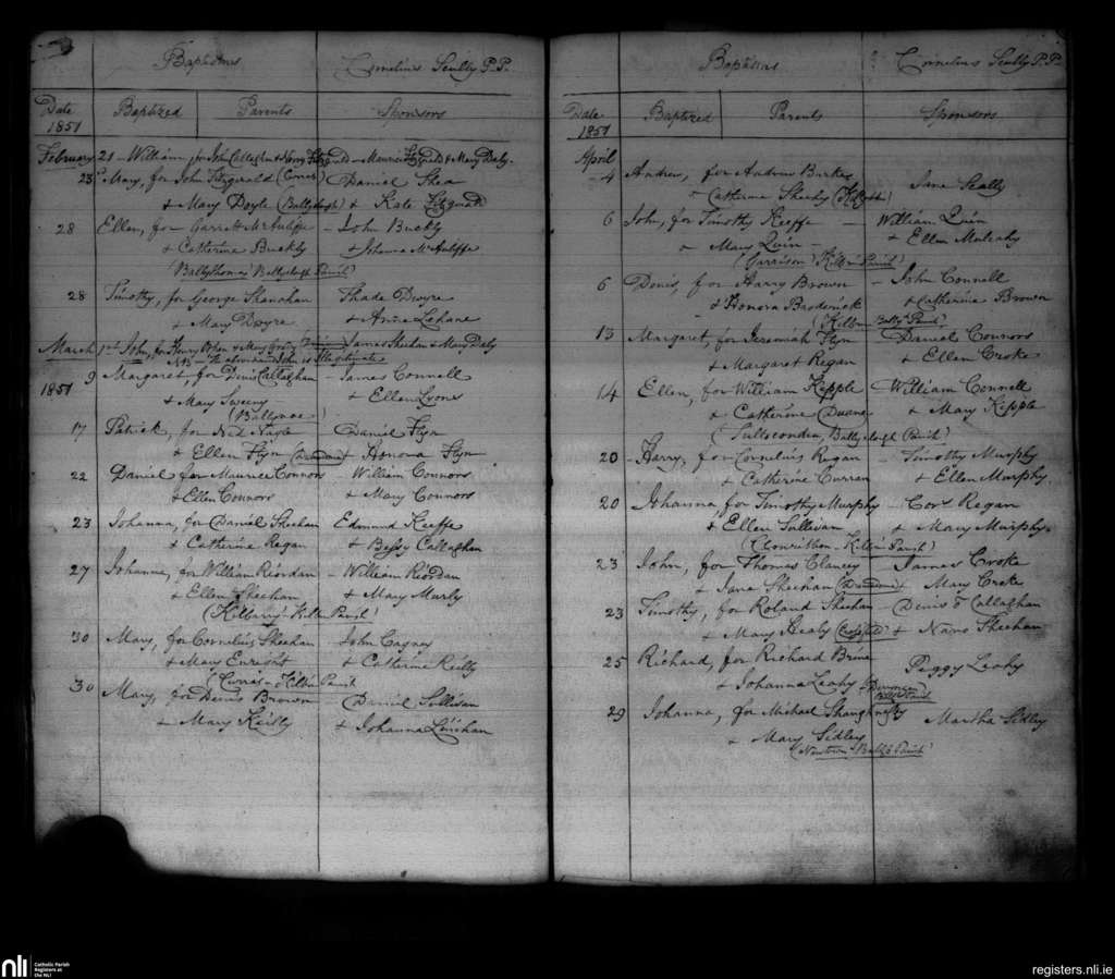 Ballyclough; County of Cork; Diocese of Cloyne. Baptisms, Feb. 1851 to Apr. 1851