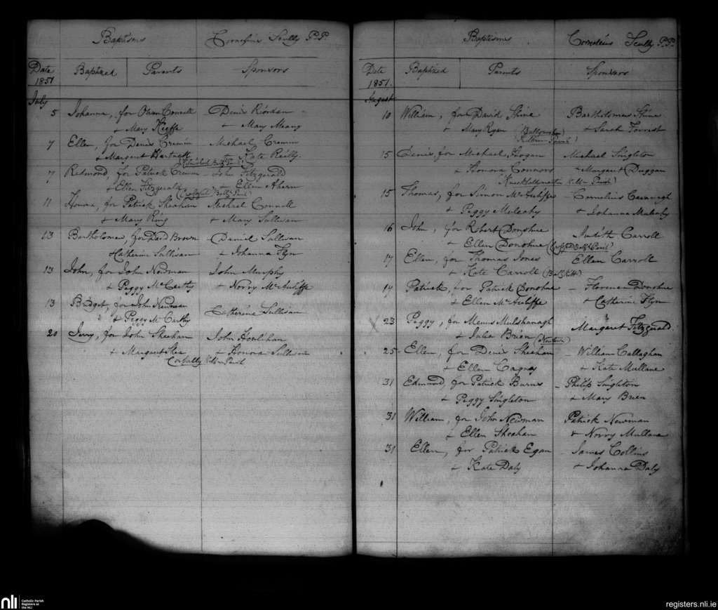 Ballyclough; County of Cork; Diocese of Cloyne. Baptisms, July 1851 to Aug. 1851