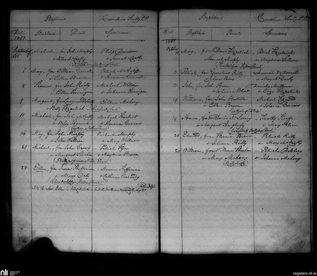 Ballyclough; County of Cork; Diocese of Cloyne. Baptisms, Sep. 1851 to Oct. 1851