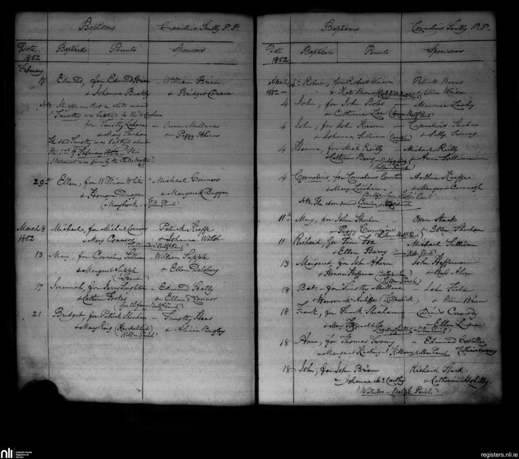 Ballyclough; County of Cork; Diocese of Cloyne. Baptisms, Feb. 1852 to Apr. 1852