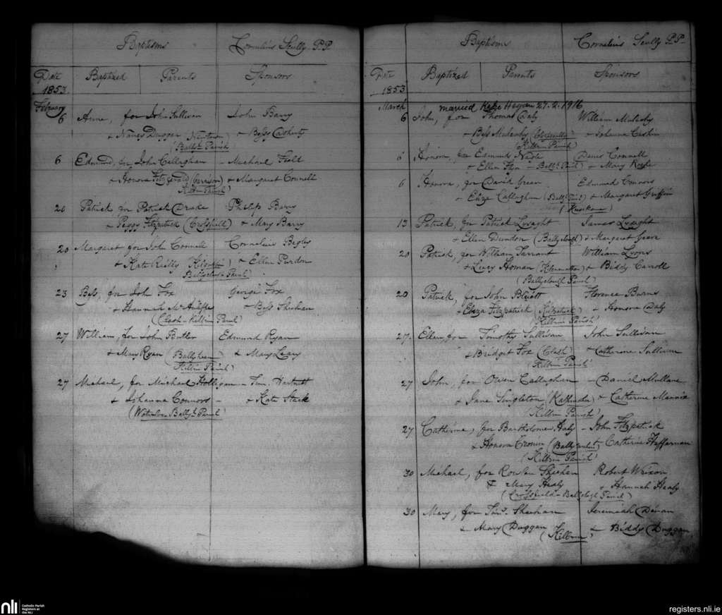 Ballyclough; County of Cork; Diocese of Cloyne. Baptisms, Feb. 1853 to Mar. 1853