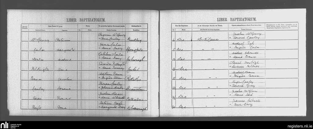Ballysodare and Kilvarnet; County of Sligo; Diocese of Achonry. Baptisms, Dec. 1844