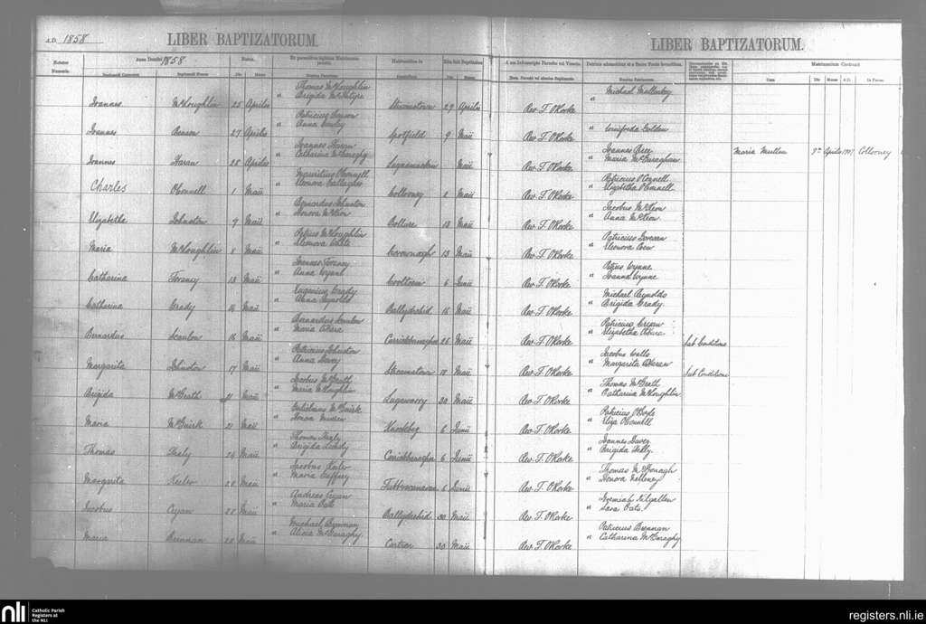 Ballysodare and Kilvarnet; County of Sligo; Diocese of Achonry. Baptisms, Apr. 1858 to June 1858