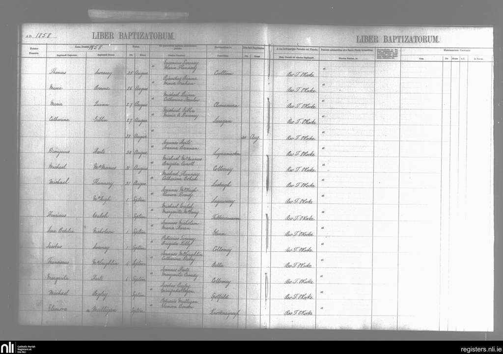 Ballysodare and Kilvarnet; County of Sligo; Diocese of Achonry. Baptisms, Aug. 1858