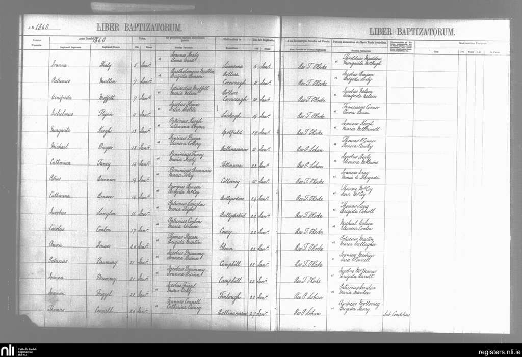Ballysodare and Kilvarnet; County of Sligo; Diocese of Achonry. Baptisms, Jan. 1860