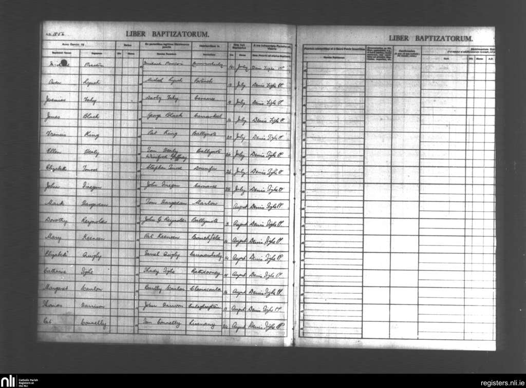 Emlefad and Kilmorgan; County of Sligo; Diocese of Achonry. Baptisms, July 1856 to Aug. 1856