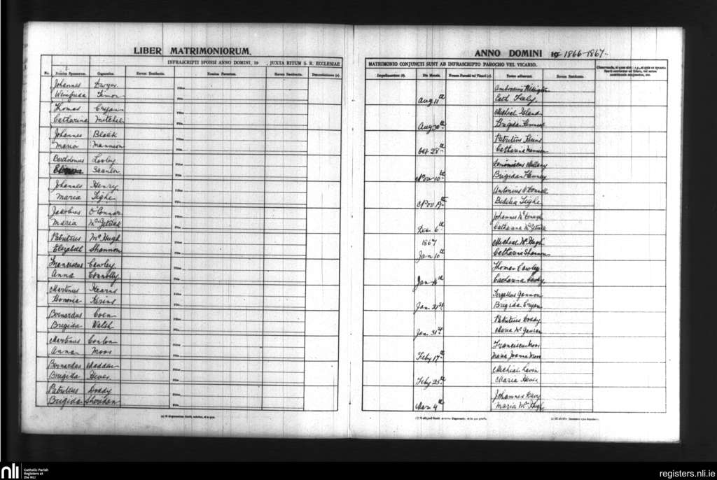 Emlefad and Kilmorgan; County of Sligo; Diocese of Achonry. Marriages, Aug. 1866 to Mar. 1867