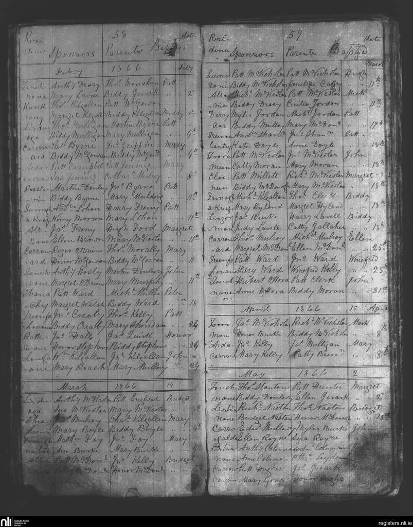 Bohola; County of Mayo; Diocese of Achonry. Baptisms, Feb. 1866 to May 1866