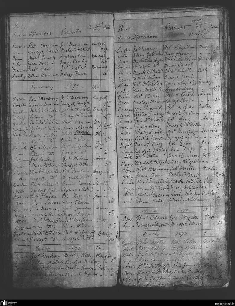 Bohola; County of Mayo; Diocese of Achonry. Baptisms, Dec. 1869 to Apr. 1870