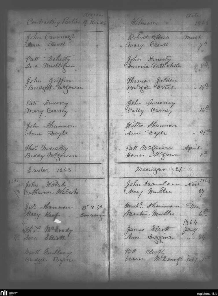 Bohola; County of Mayo; Diocese of Achonry. Marriages, Mar. 1863 to Feb. 1864