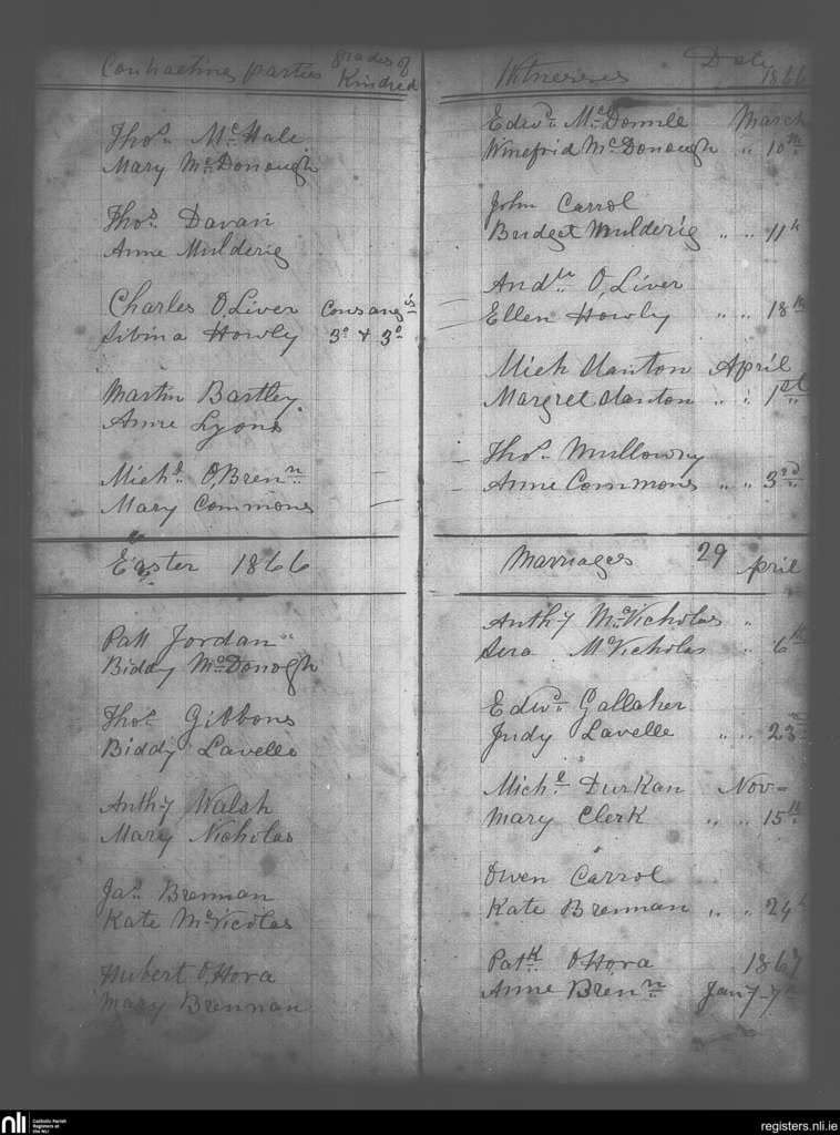 Bohola; County of Mayo; Diocese of Achonry. Marriages, Mar. 1866 to Jan. 1867