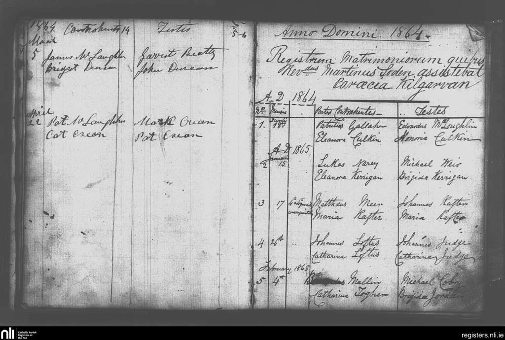 Kilgarvin; County of Mayo; Diocese of Achonry. Marriages, Mar. 1864 to Feb. 1865