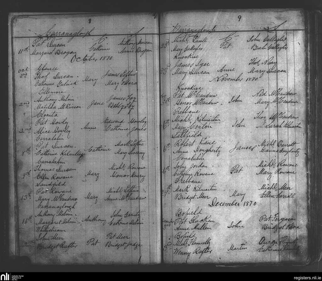 Kilgarvin; County of Mayo; Diocese of Achonry. Baptisms, Sep. 1870 to Dec. 1870