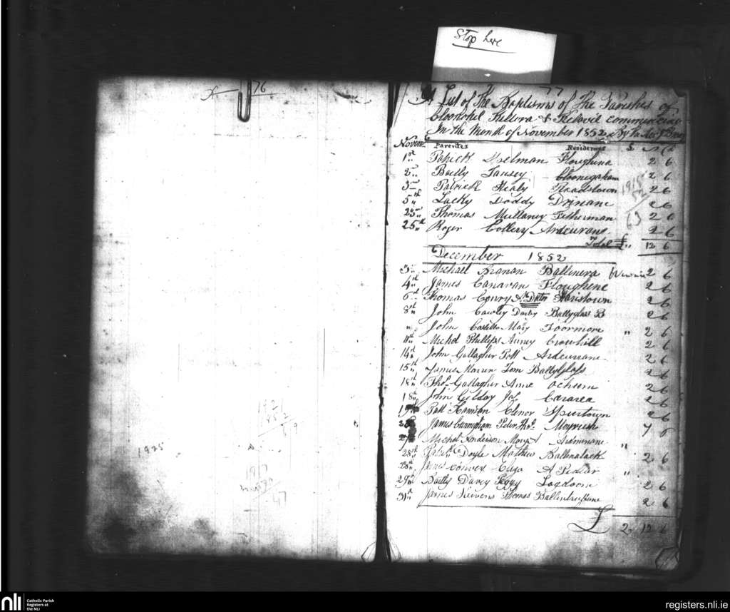 Kilshalvey; County of Sligo, Mayo; Diocese of Achonry. Baptisms, Nov. 1852 to Dec. 1852
