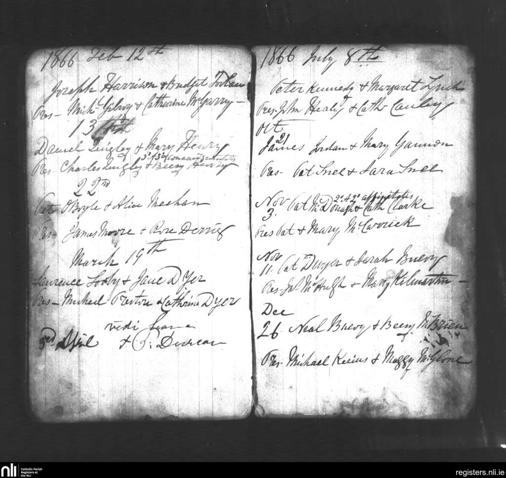 Killoran; County of Sligo; Diocese of Achonry. Marriages, Feb. 1866 to Dec. 1866