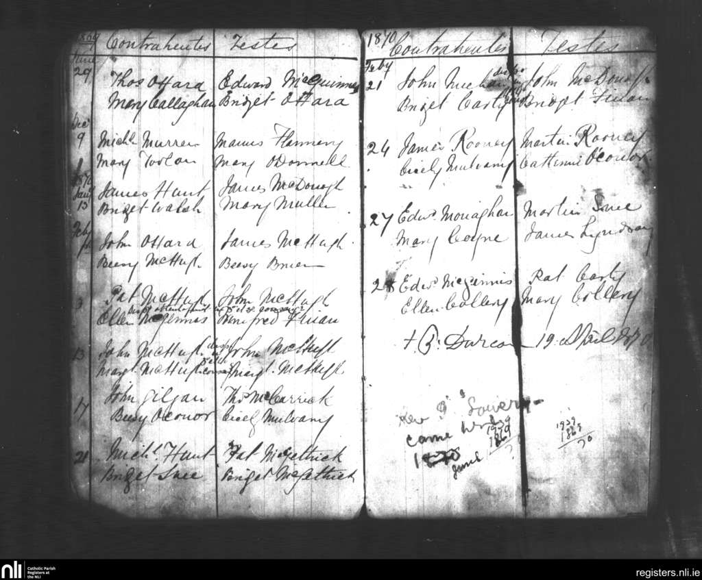 Killoran; County of Sligo; Diocese of Achonry. Marriages, June 1869 to Feb. 1870