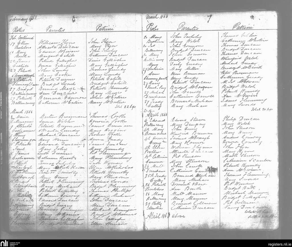 Curry; County of Sligo; Diocese of Achonry. Baptisms, Feb. 1868 to Apr. 1868