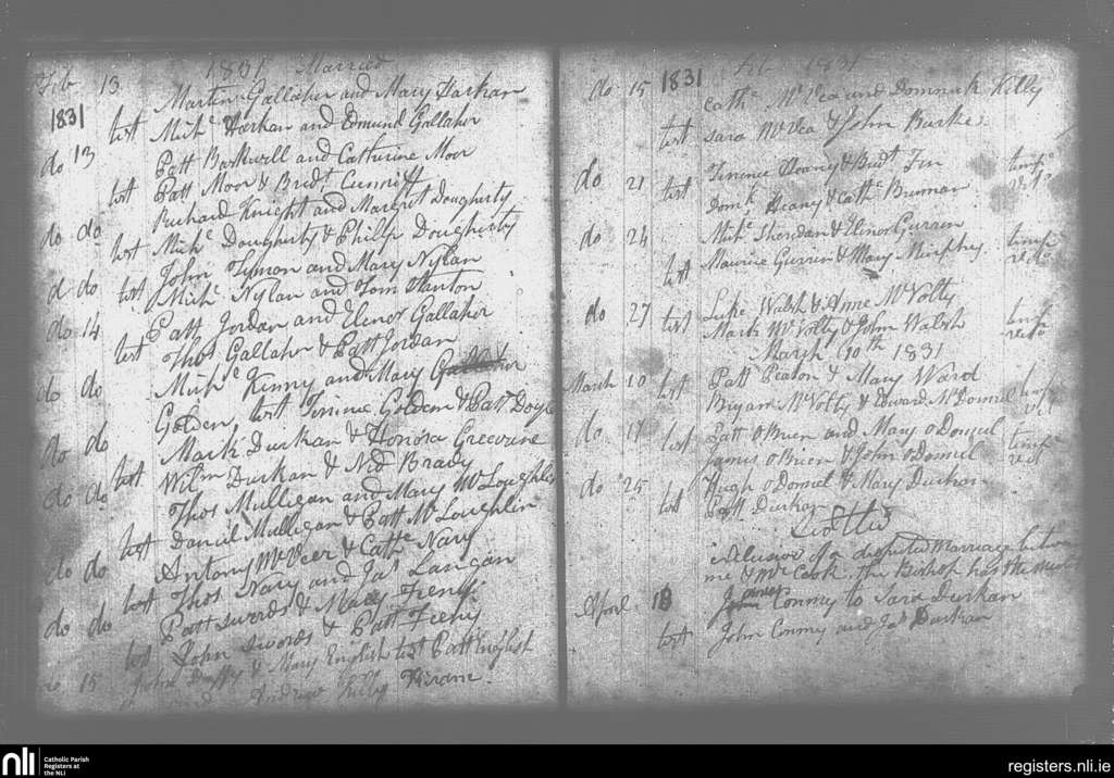 Swineford; County of Mayo; Diocese of Achonry. Marriages, Feb. 1831 to Apr. 1831