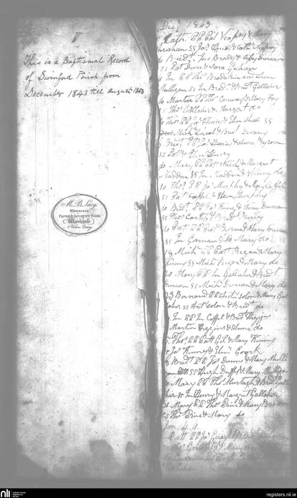 Swineford; County of Mayo; Diocese of Achonry. Baptisms, Dec. 1843 to Jan. 1844
