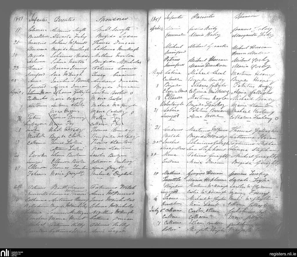 Swineford; County of Mayo; Diocese of Achonry. Baptisms, Mar. 1851 to July 1851