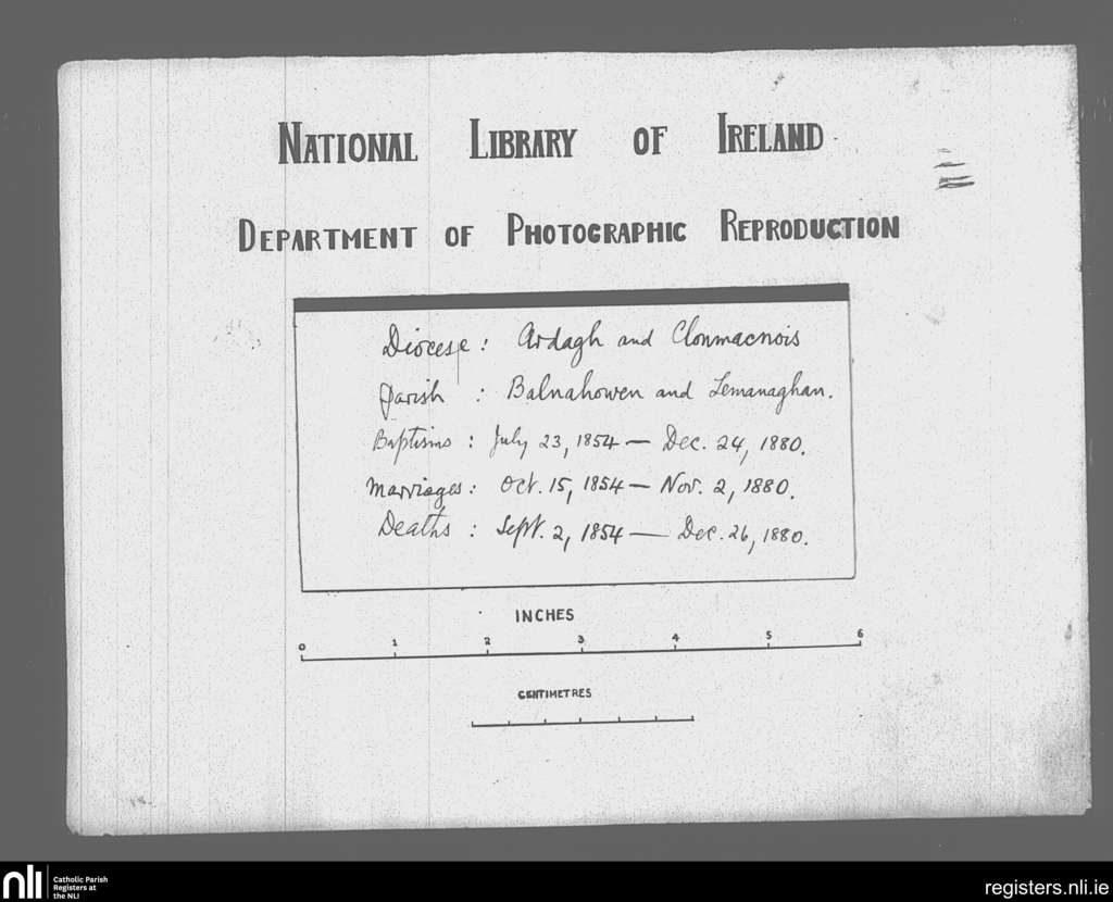 Ballinahown; County of Westmeath, Offaly; Diocese of Ardagh. Baptisms, Marriages, Deaths