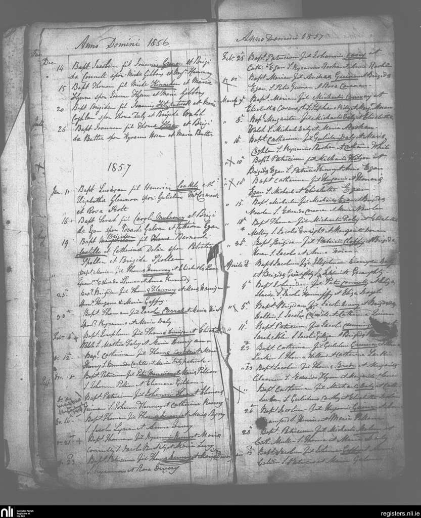 Ballinahown; County of Westmeath, Offaly; Diocese of Ardagh. Baptisms, Dec. 1856 to May 1857