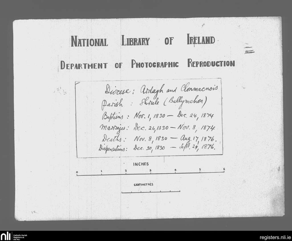 Shrule; County of Longford; Diocese of Ardagh. Baptisms, Marriages, Deaths, Dispensations