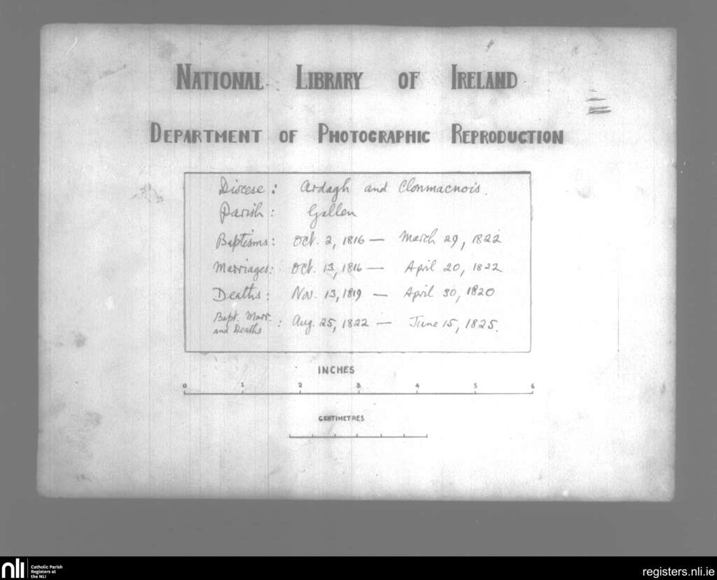 Gallen and Reynagh; County of Offaly; Diocese of Ardagh. Baptisms, Marriages, Deaths