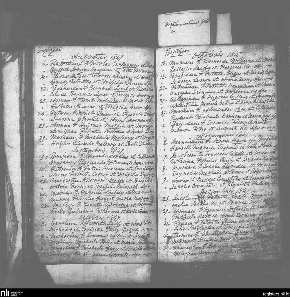 Drumlish; County of Longford; Diocese of Ardagh. Baptisms, Aug. 1847 to Dec. 1847