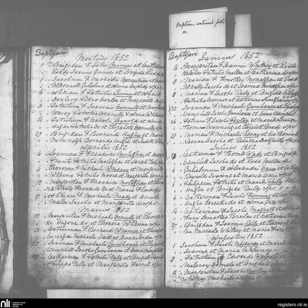 Drumlish; County of Longford; Diocese of Ardagh. Baptisms, Mar. 1852 to Aug. 1852