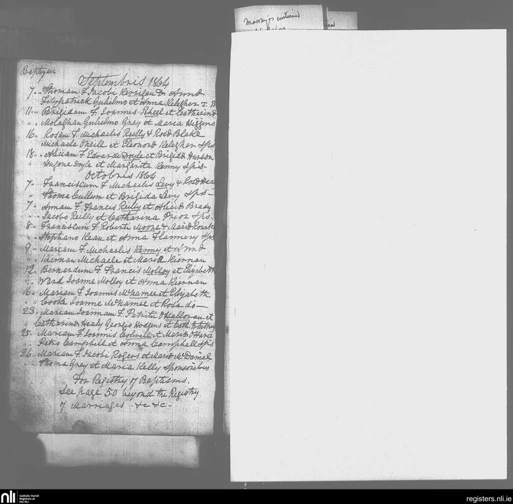Drumlish; County of Longford; Diocese of Ardagh. Baptisms, Sep. 1864 to Oct. 1864
