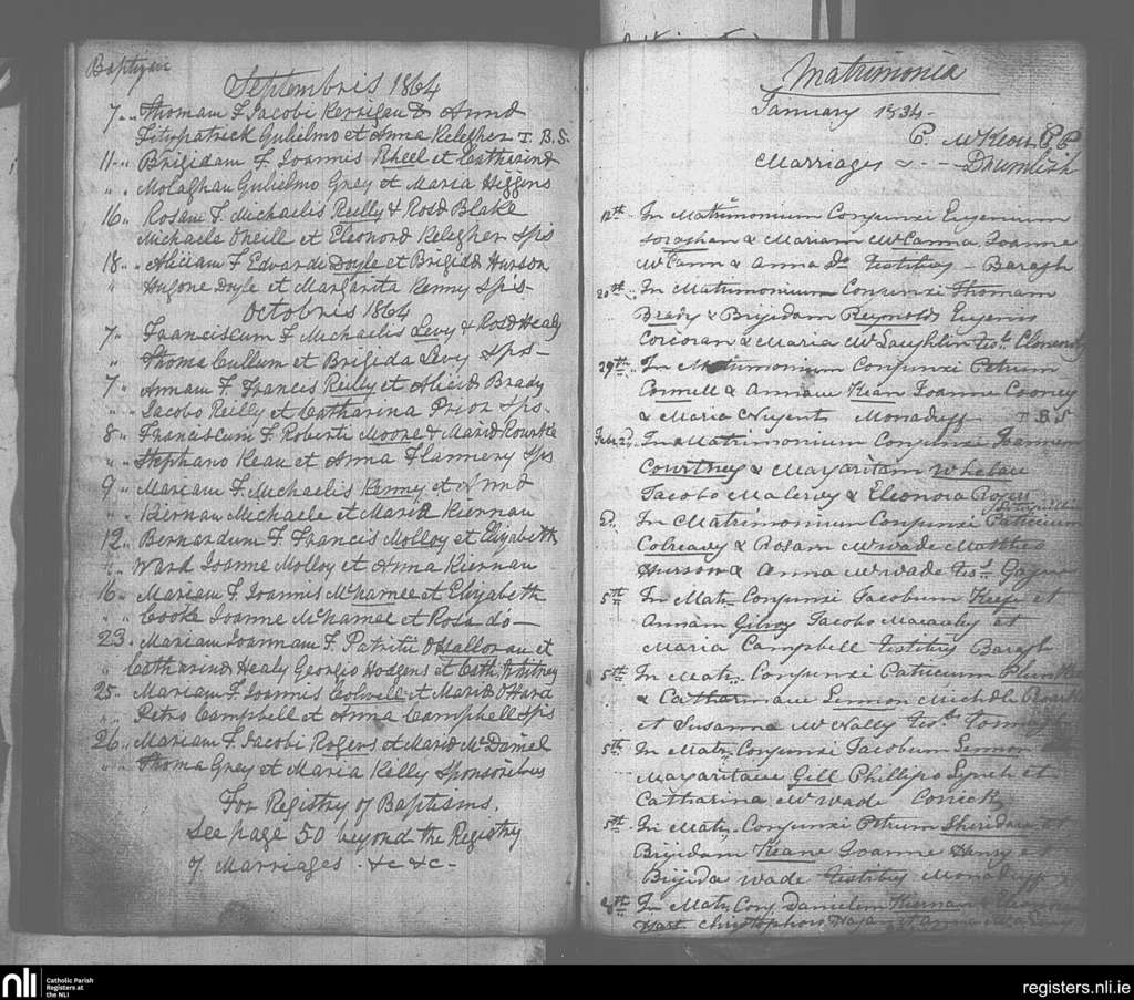 Drumlish; County of Longford; Diocese of Ardagh. Baptisms, Marriages, Jan. 1834 to Oct. 1864