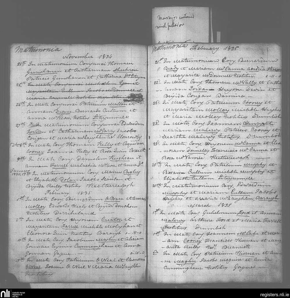 Drumlish; County of Longford; Diocese of Ardagh. Marriages, Nov. 1834 to Mar. 1835