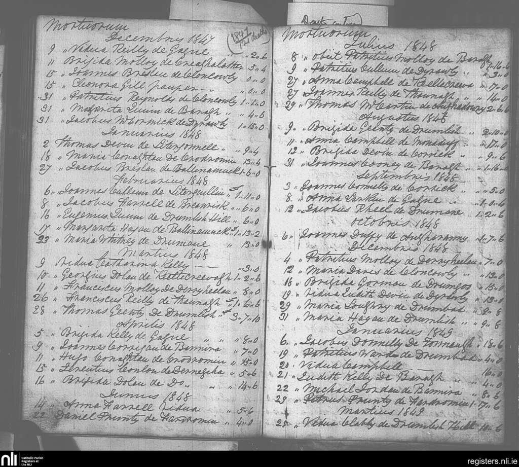 Drumlish; County of Longford; Diocese of Ardagh. Deaths, Dec. 1847 to Mar. 1849