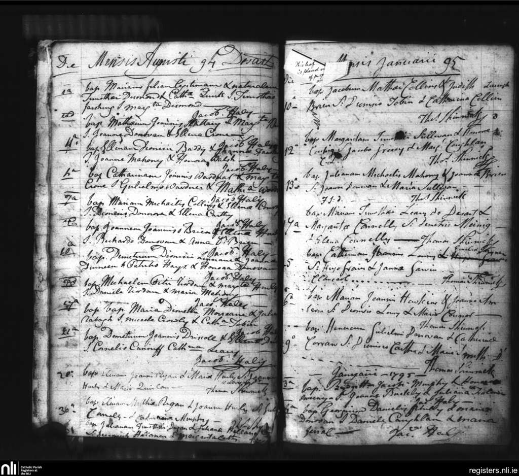 Bandon; County of Cork; Diocese of Cork and Ross. Baptisms, Aug. 1794 to Jan. 1795