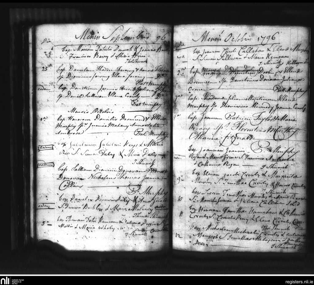 Bandon; County of Cork; Diocese of Cork and Ross. Baptisms, Sep. 1796 to Oct. 1796