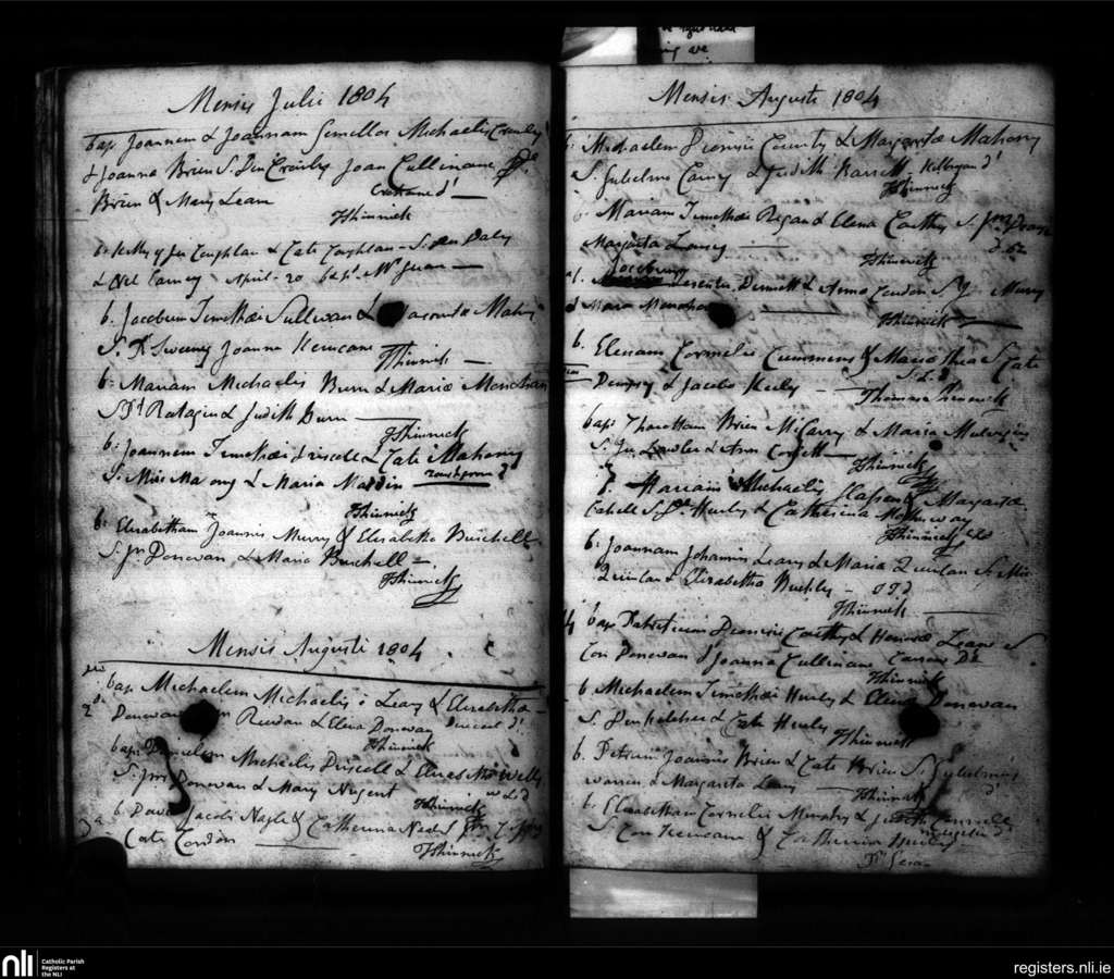 Bandon; County of Cork; Diocese of Cork and Ross. Baptisms, July 1804 to Aug. 1804