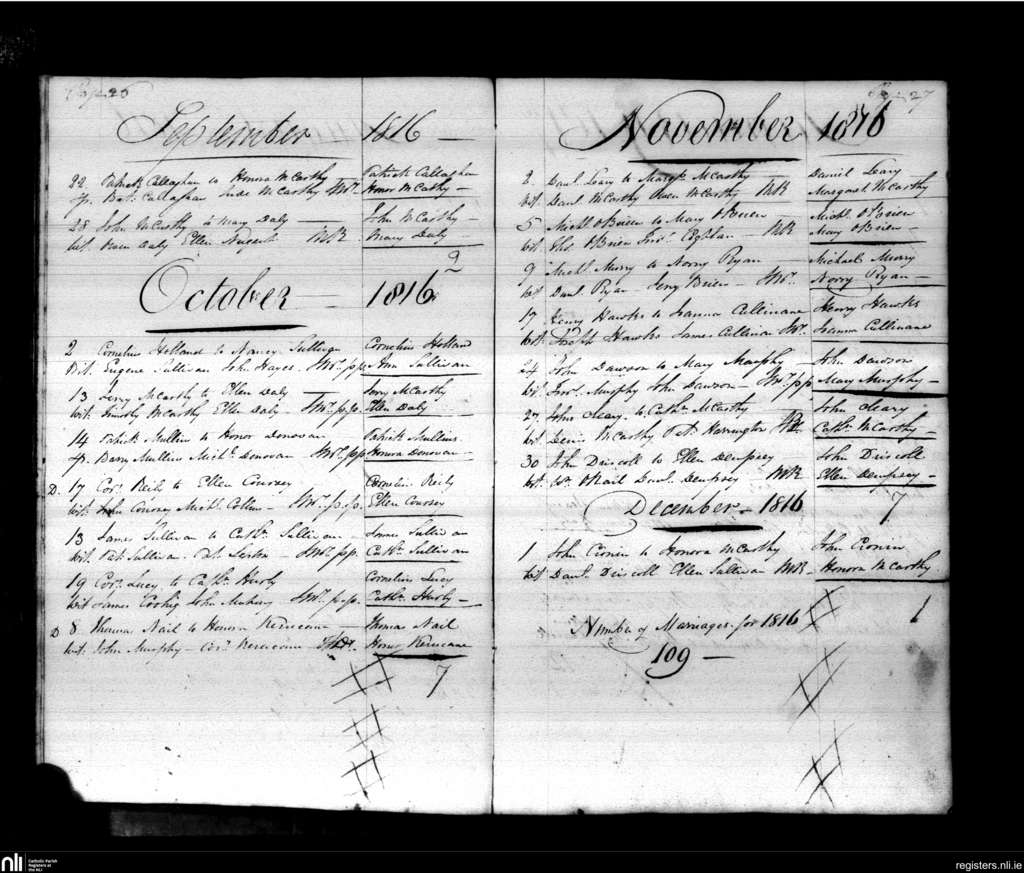 Bandon; County of Cork; Diocese of Cork and Ross. Marriages, Sep. 1816 to Dec. 1816