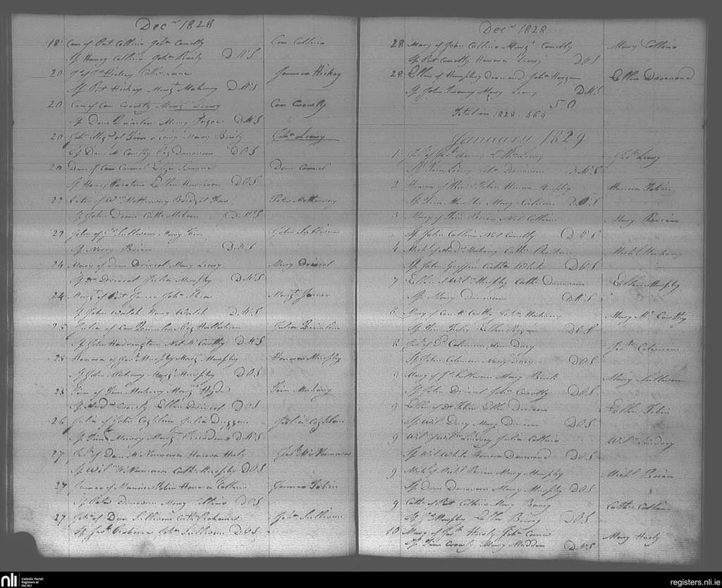 Bandon; County of Cork; Diocese of Cork and Ross. Baptisms, Dec. 1828 to Jan. 1829