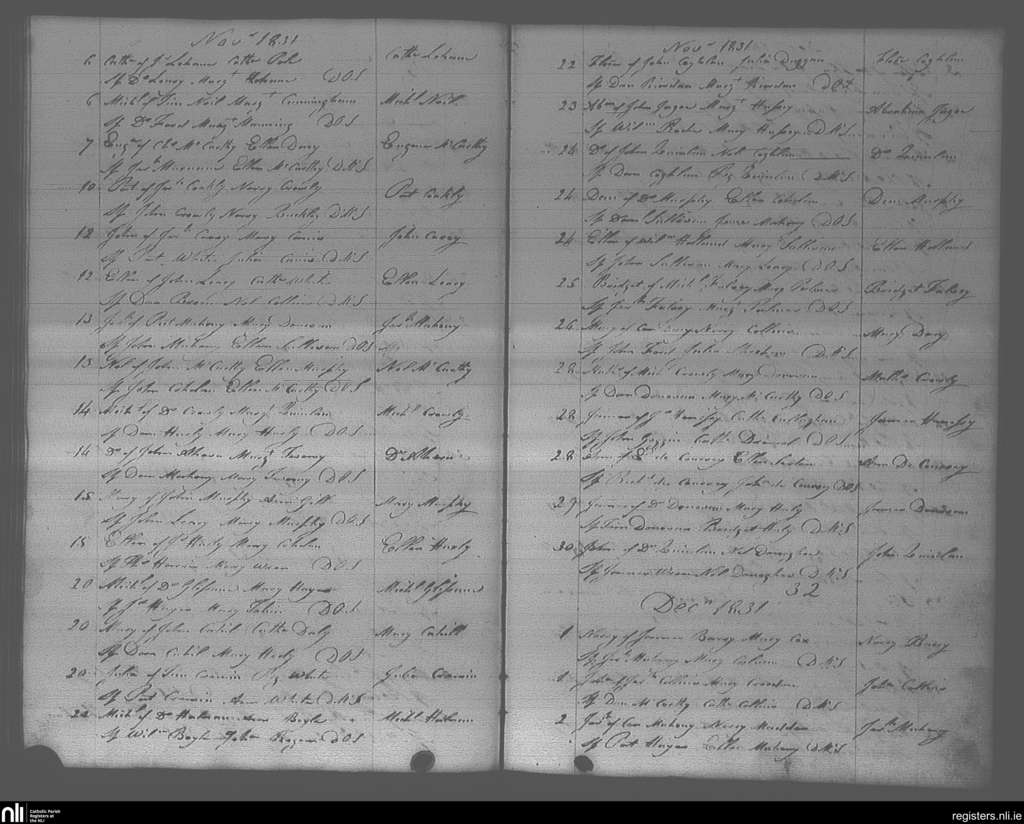 Bandon; County of Cork; Diocese of Cork and Ross. Baptisms, Nov. 1831 to Dec. 1831
