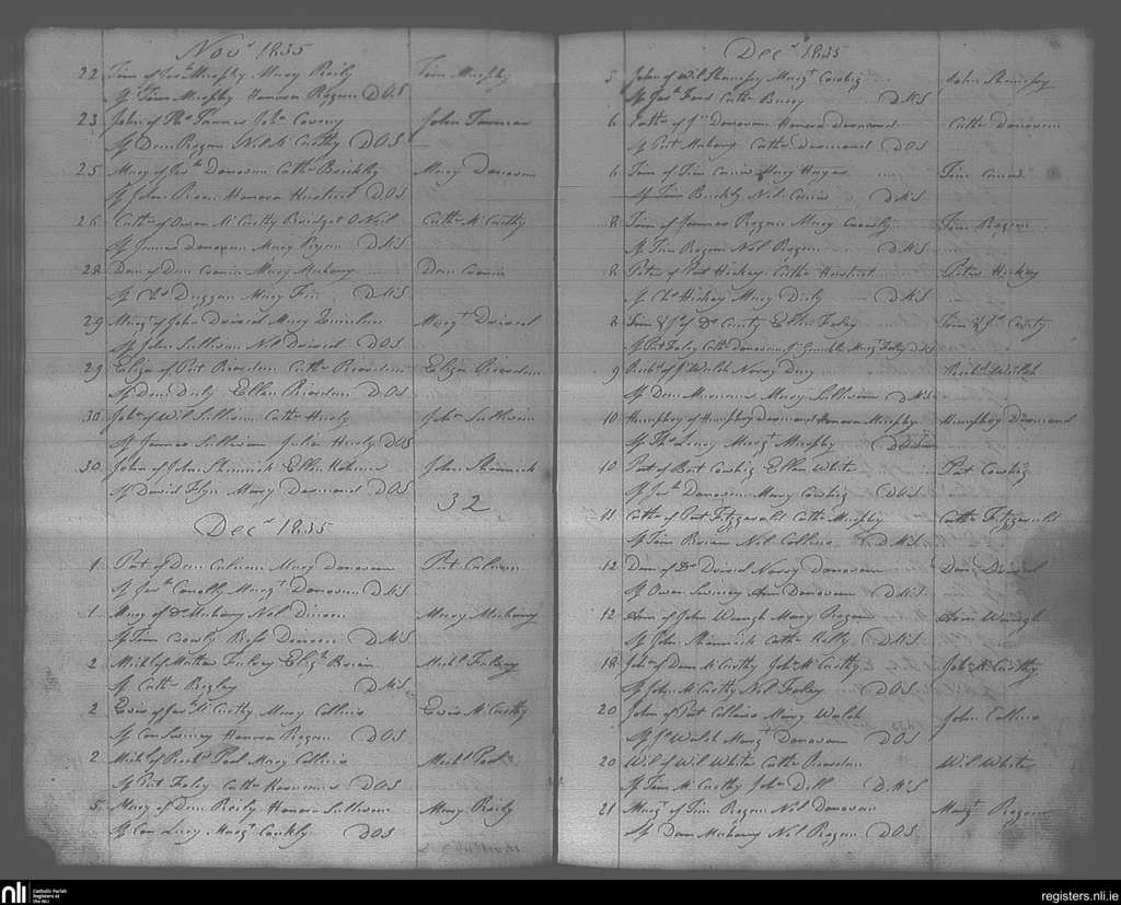 Bandon; County of Cork; Diocese of Cork and Ross. Baptisms, Nov. 1835 to Dec. 1835