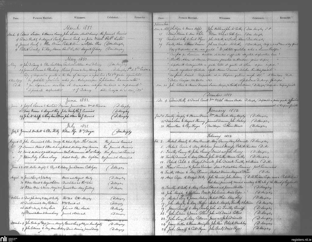 Bandon; County of Cork; Diocese of Cork and Ross. Marriages, Mar. 1851 to Feb. 1852