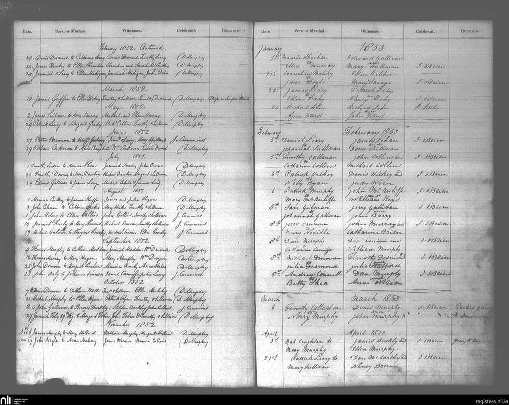Bandon; County of Cork; Diocese of Cork and Ross. Marriages, Feb. 1852 to Apr. 1853