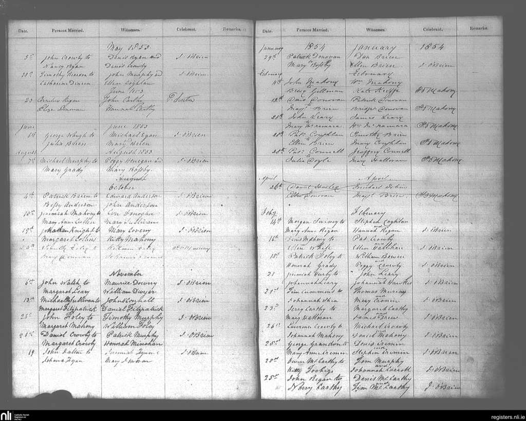 Bandon; County of Cork; Diocese of Cork and Ross. Marriages, May 1853 to Feb. 1854