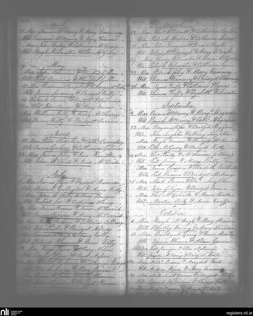 Killenummery; County of Sligo, Leitrim; Diocese of Ardagh. Marriages, Apr. 1833 to Oct. 1833