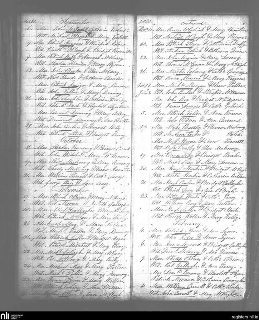 Killenummery; County of Sligo, Leitrim; Diocese of Ardagh. Marriages, Sep. 1841 to Feb. 1842