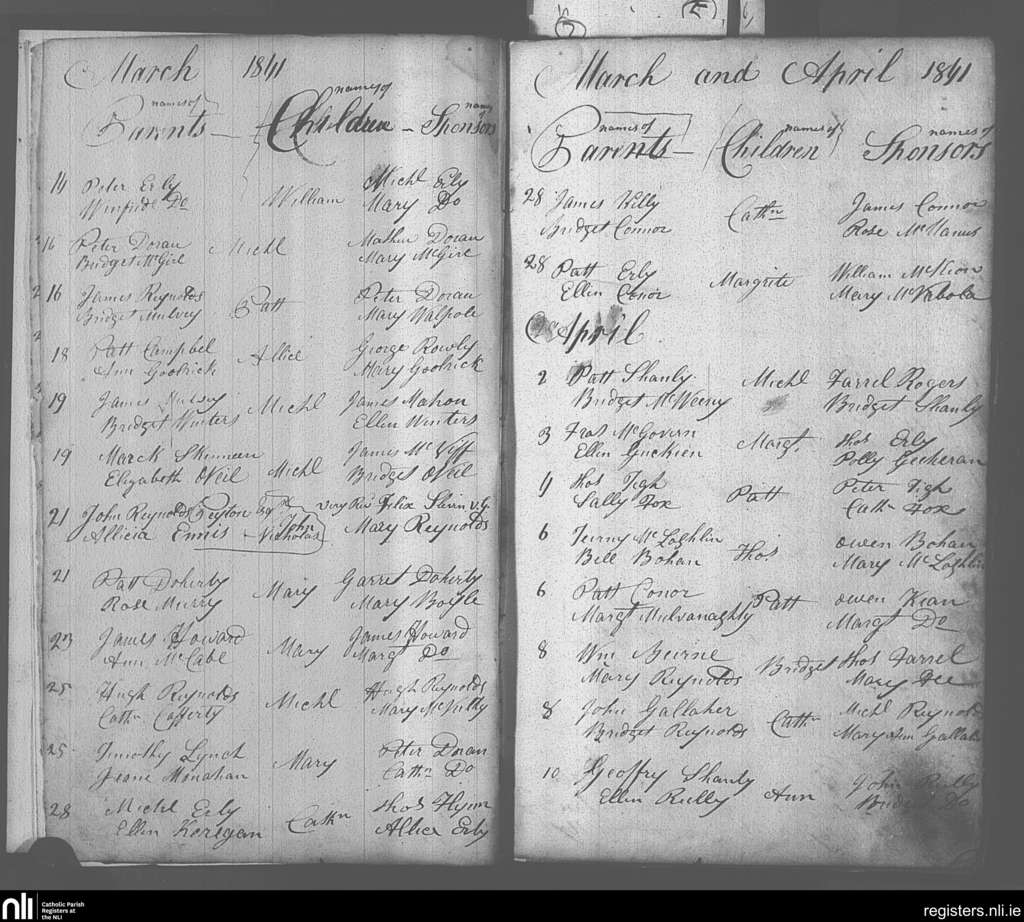 Kiltubrid; County of Leitrim; Diocese of Ardagh. Baptisms, Mar. 1841 to Apr. 1841