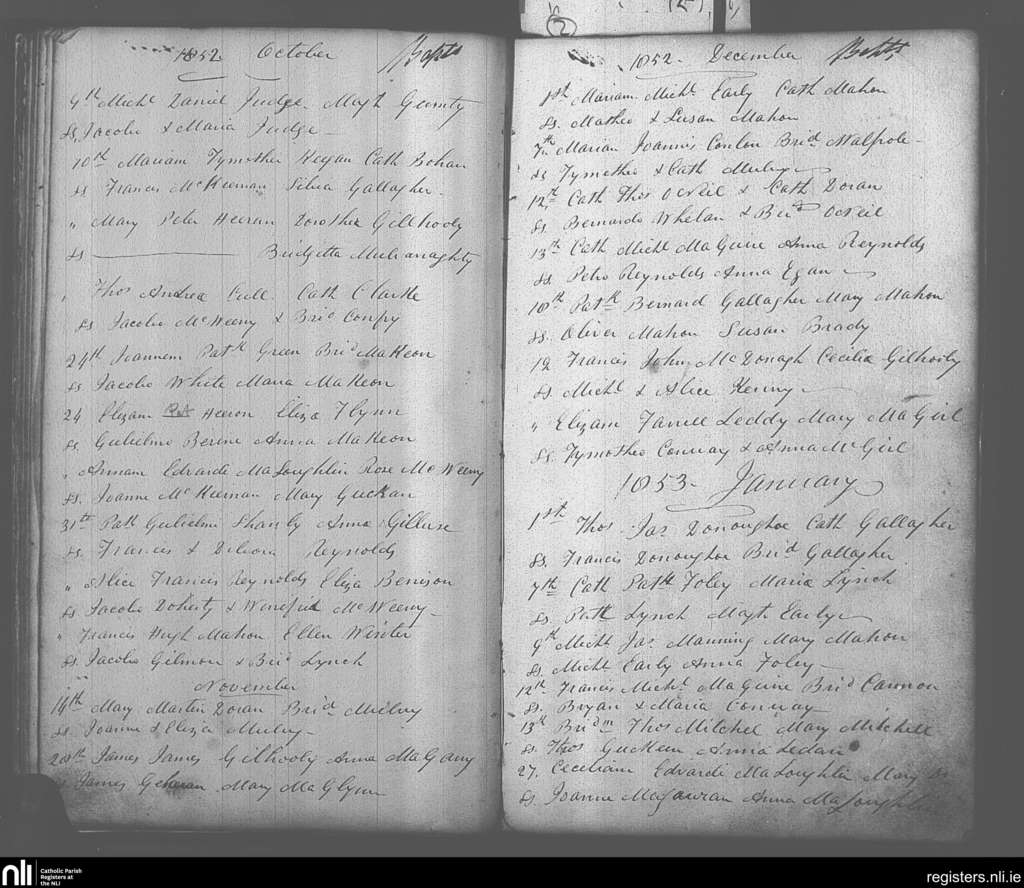 Kiltubrid; County of Leitrim; Diocese of Ardagh. Baptisms, Oct. 1852 to Jan. 1853