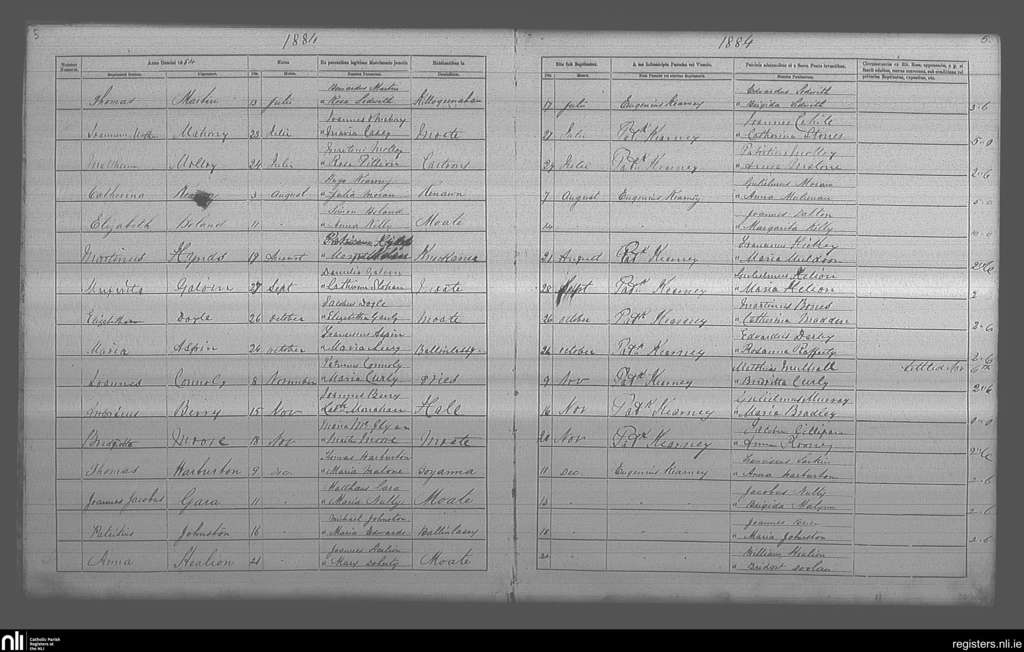 Moate; County of Offaly, Westmeath; Diocese of Ardagh. Baptisms, July 1884 to Dec. 1884